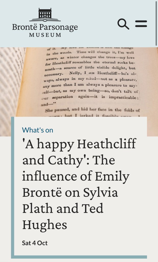 I am honoured to be invited to deliver this year’s Annual Lecture for the Brontë Society on 4 October St James’ Church, Thornton. My talk is based on new (book) research looking at Emily’s influence on successive women writers and is entitled ‘A happy Heathcliff and Cathy’: The influence of Emily Brontë on Sylvia Plath and Ted Hughes. See you there!